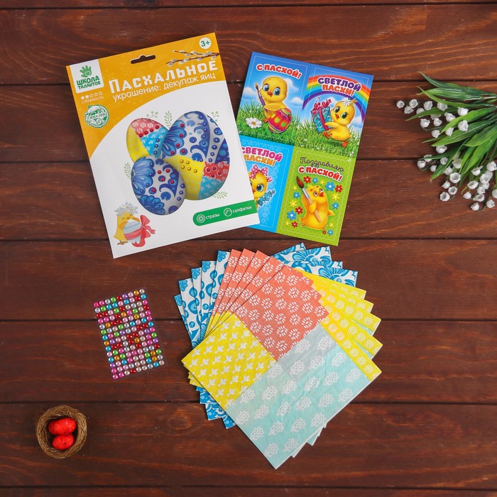 Придумывайте собственный дизайн, комбинируйте элементы и радуйте своих близких и друзей! В наборе специальные салфетки для декупажа и стразы.