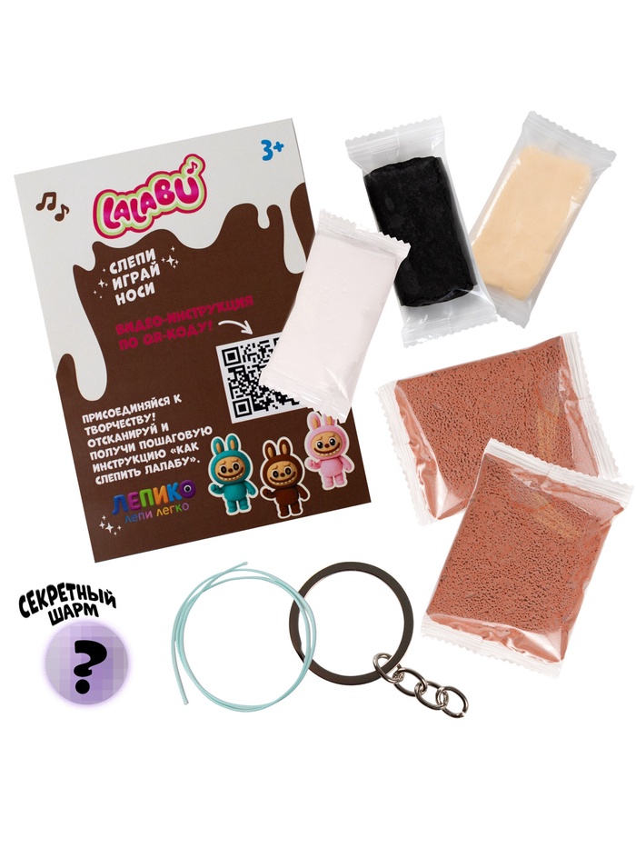 В наборе: легкий пластилин - 4 цвета; фурнитура (кольцо для брелока, шнурок); секретный шарм.
