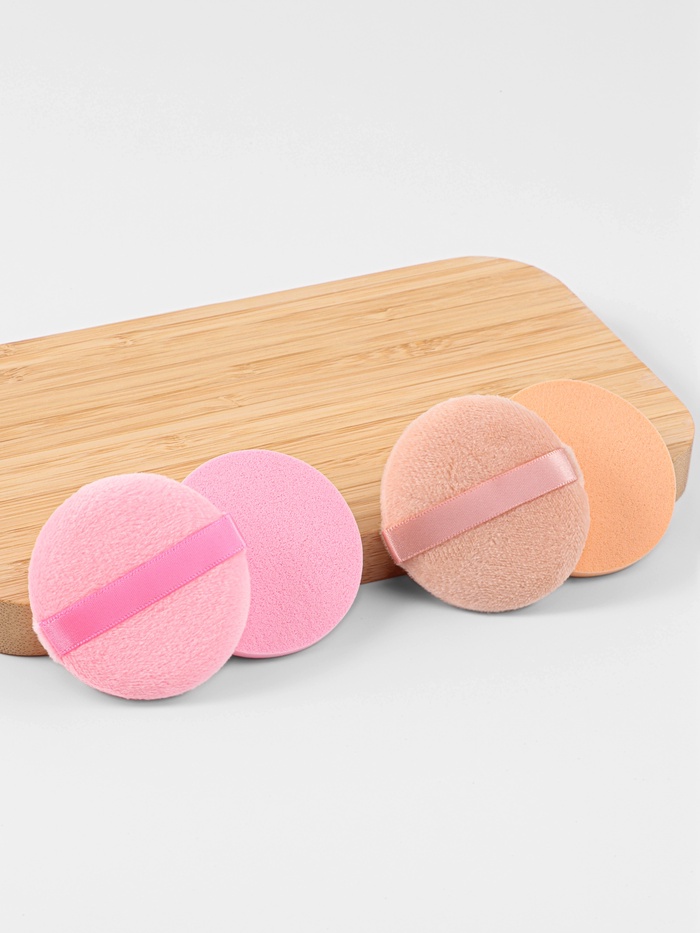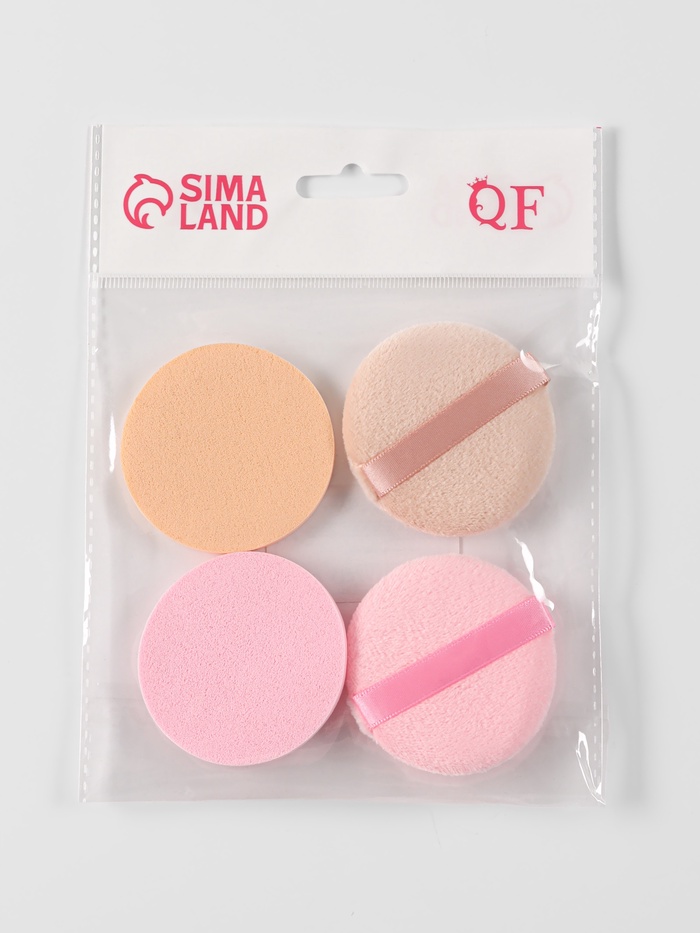 - Состав — 2 пуховки и 2 спонжа, подходящие для нанесения и коррекции макияжа.
