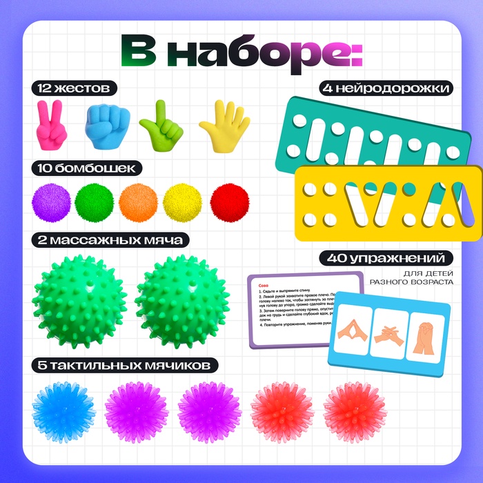 Набор для нейрогимнастики — это интересные упражнения для развития мозга и тела ребёнка. Набор включает 40 карточек с заданиями, тактильные мячики, массажные мячи, мягкие бомбошки, фигурки жестов и нейродорожки. Играя, дети развивают речь, внимание, а также улучшают координацию движений.