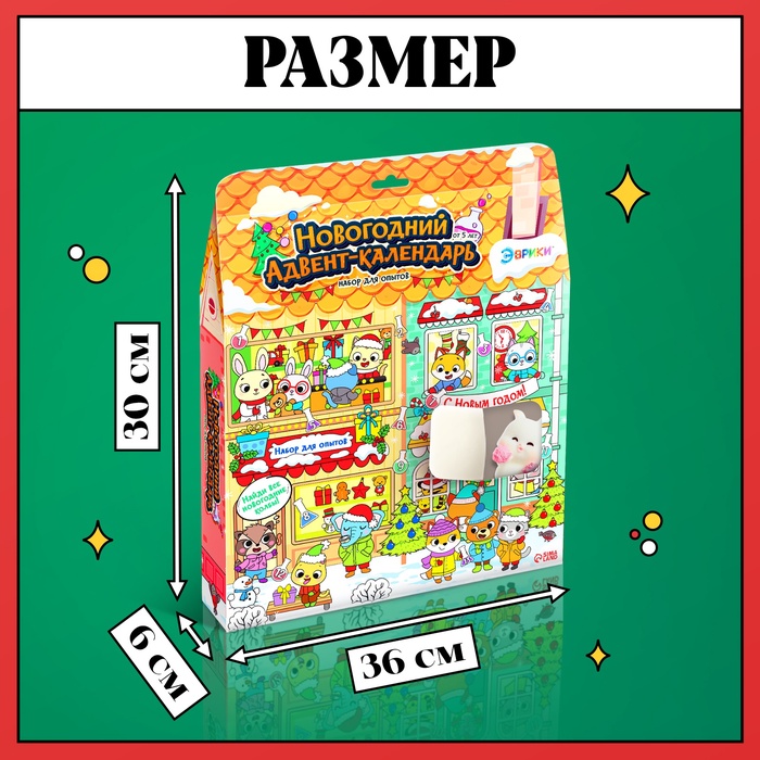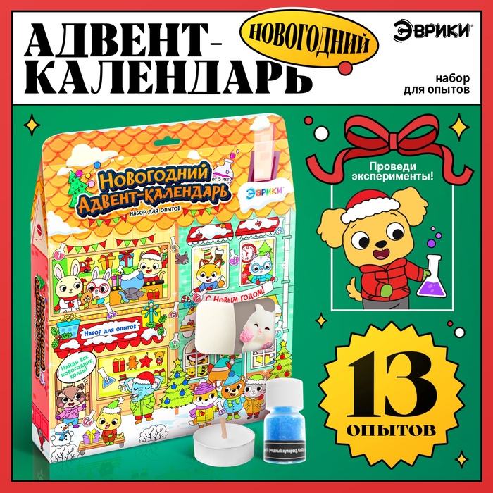 Адвент-календарь скрасит дни в ожидании праздника и поможет весело и с пользой провести время. Набор представляет собой коробку с 13 окошками. Новый день — это новое окошко, в котором находятся материалы для проведения опытов.