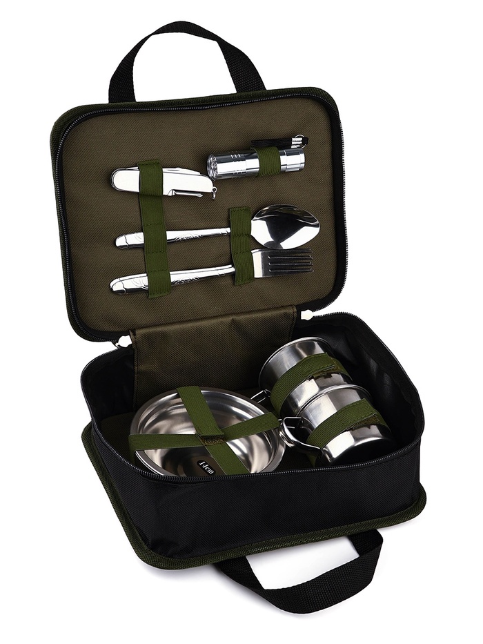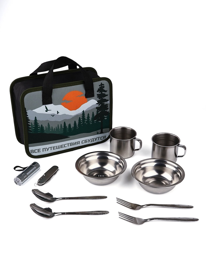Набор для пикника с сумкой — идеальное решение для комфортного отдыха на природе. В комплект входят 10 предметов: две тарелки, две кружки, две ложки, две вилки, фонарик и мультитул.