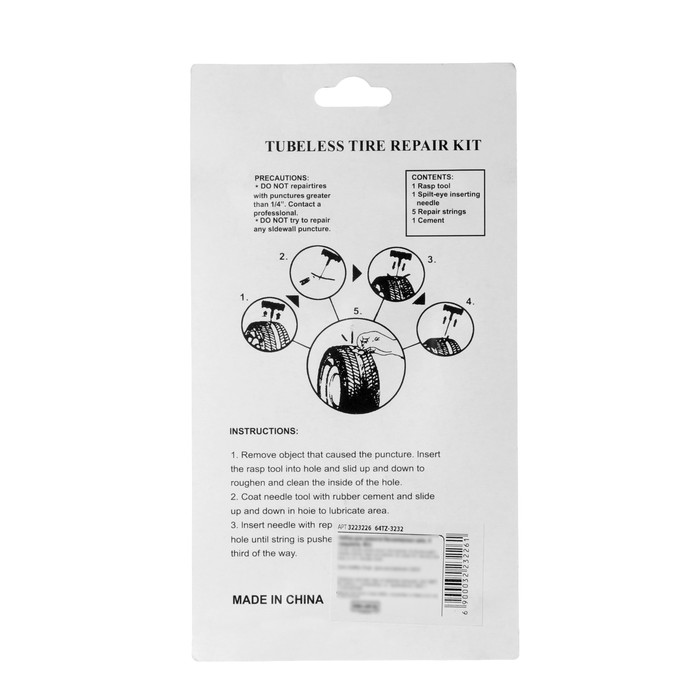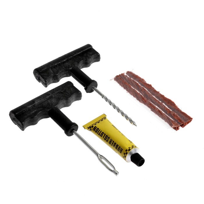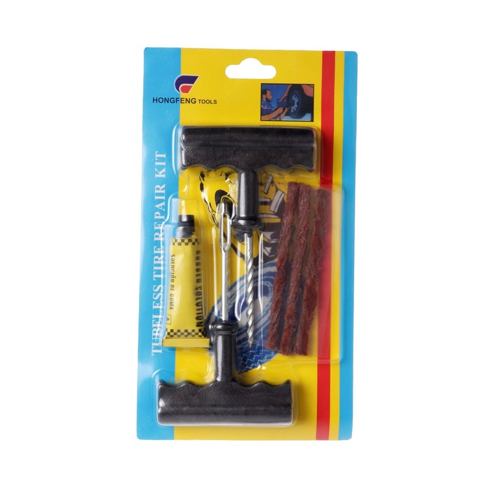 Набор-аптечка для ремонта бескамерных автомобильных шин незаменим в случае, если нужно самостоятельно устранить прокол или порез - в том числе, в дорожных условиях. С помощью входящих в комплект для ремонта компонентов - приспособлений для зачистки проколов и вставки жгутов, а также непосредственно жгутов-шнуров и тубы клея - можно оперативно восстановить целостность шины своими руками, не прибегая для этого к услугам шиномонтажа. Жгуты и клей для ремонта шин своими руками поставляются упакованными в блистер; универсальный компактный набор для ремонта проколов и боковых порезов бескамерных шин!
