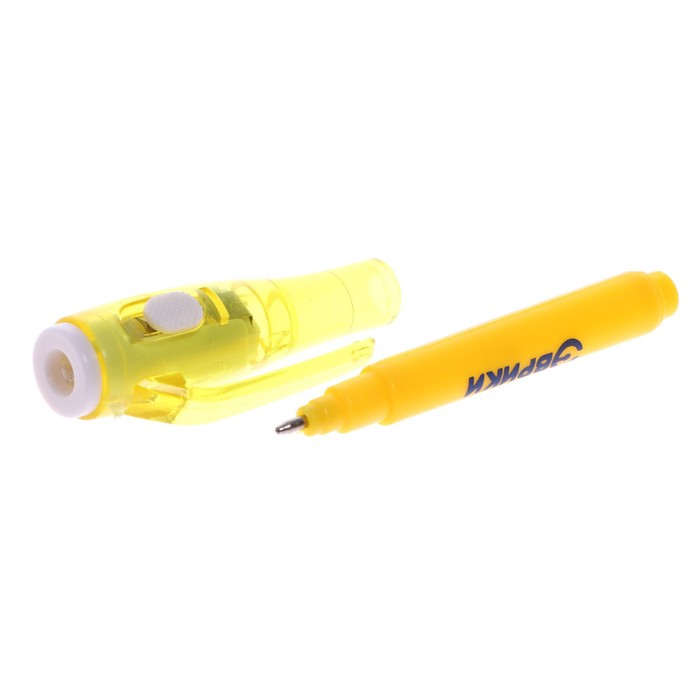 У волшебной ручки есть ещё одна функция — невидимые чернила. Снимите колпачок и напишите что-нибудь на листе бумаги, а затем посветите фонариком, и текст проявится. Можно оставлять невидимые послания для друзей, как настоящий шпион!