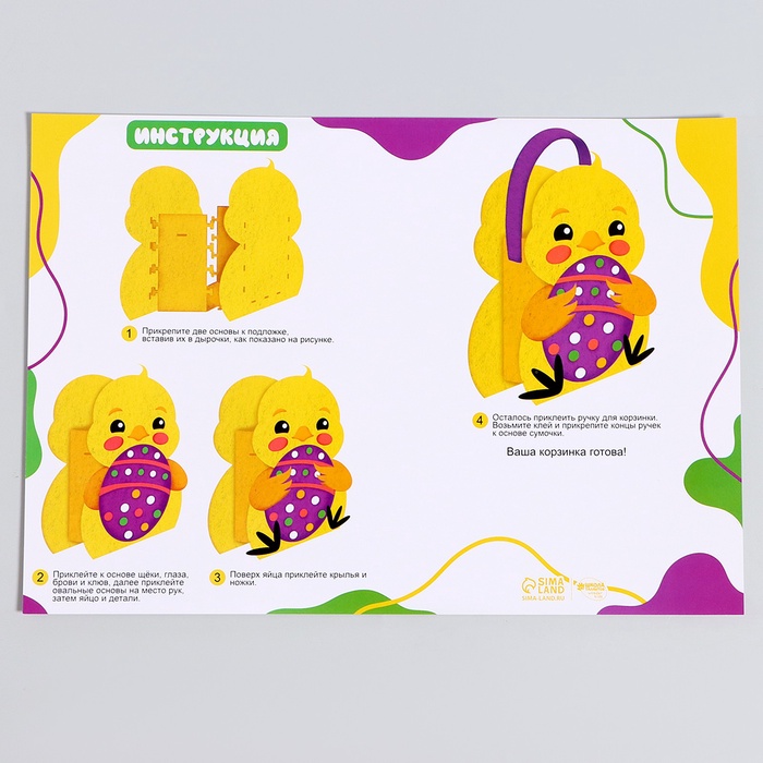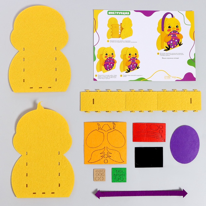 Детям нравится создавать поделки из самых невероятных материалов. Оригинальный набор для создания фетровой корзиночки по-настоящему увлечёт ребёнка и станет удачным подарком для талантливого малыша! Теперь вам не нужно вырезать детали вручную, просто отделите защитную пленку и приклейте их на нужное место.
