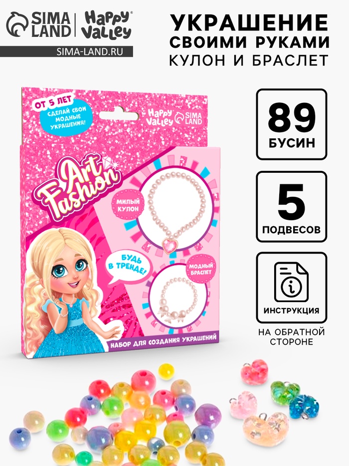 В комплекте есть всё необходимое для этого: основа для браслета и кулона, бусины разных размеров, подвесы.