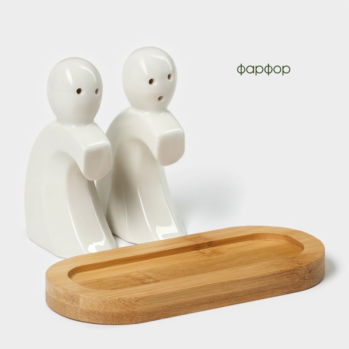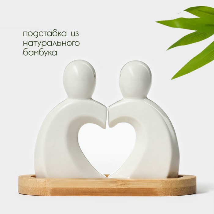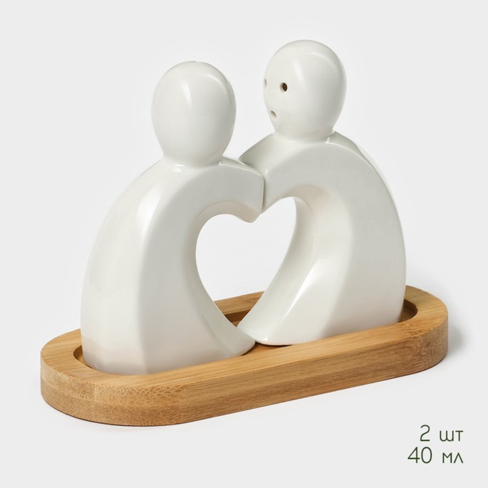 Набор для специй BellaTenero «Влюбленность», 2 предмета: солонка 40 мл, перечница 40 мл, на бамбуковой подставке, фарфор, белый