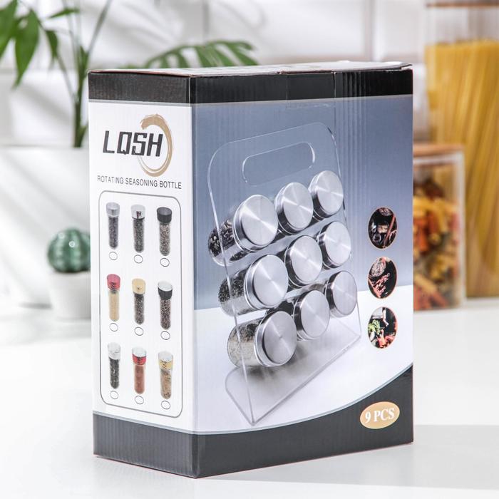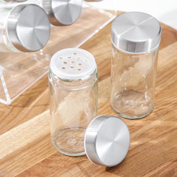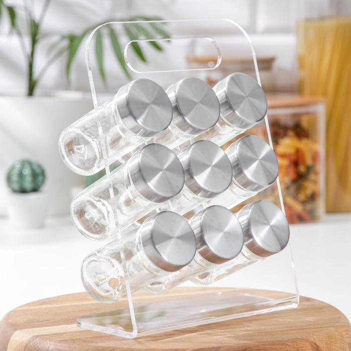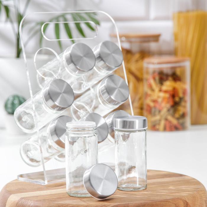 Набор для специй из стекла на подставке.