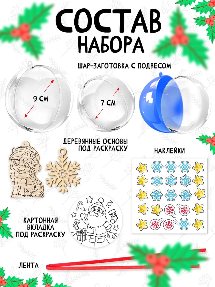 - В набор входят 8 элементов: деревянные заготовки в виде лошадки и шаров, декоративные наклейки, ленты для подвешивания и яркие детали для украшения.