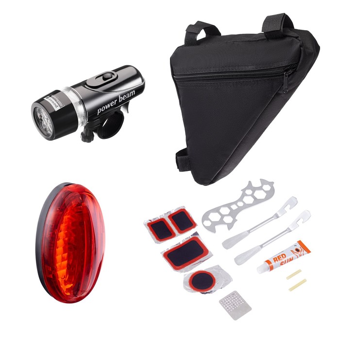 Набор для велосипеда 3 в 1: фонарь, ремонтный набор, сумка 20 х 20 х 27 см. Набор инструментов для велосипеда необходим для выполнения различных работ по обслуживанию и ремонту велосипеда. С помощью такого набора вы сможете самостоятельно устранить большинство неисправностей, а также провести профилактический осмотр и настройку своего велосипеда. Например, можно заменить камеру или покрышку, настроить тормозную систему, выполнить ремонт рамы или вилки. В набор входит: черная сумка из оксфорда, которую можно прикрепить на раму велосипеда; 1 комбинированный (семейный) ключ выполнен из металла, 2 монтировки (монтажки) для перебортовки колес выполнены из металла, 5 заплаток для шин, 1 клей, 1 наждачка для зачистки, 2 резинки на ниппель, ключ накидной для снятия топкэпа вилок велосипеда, фонарь и фара. Фонарь и фара имеют степень пыле и влагозащиты, которая позволит наслаждаться вело прогулками не зависимо от погодных условий. Велосипедная фара имеет яркость свечения в 100 люмен и дальность луча на 50 метров, что обеспечивает широкий угол освещения дороги впереди. Фара для велосипеда с 2 режимами свечения позволяет настроить интенсивность под себя. Передний фонарь работает на батарейках от четырёх батареек ААА "мизинчиковых". Фара на велосипед с простым креплением даёт возможность установки на раму или руль в считанные секунды, благодаря удобному хомуту с резиновой подкладкой, который плотно обхватывает руль и предотвращает прокручивание во время езды. Установочный диаметр 2-2,8см. Удобная и яркая фара на велосипед имеет преимущество среди подобных моделей — это выпуклая и удобная кнопка по центру корпуса. Задний свет на велосипед идёт в комплекте к передней фаре. Он так же защищён от влаги и грязи. Задний фонарик на велосипед обладает яркостью в 50 люмен, что достаточно для ночных поездок, теперь ваши габариты точно будут видны даже в полном мраке и при полном отсутствии других источников света. Задний габарит имеет 3 типа свечения, регулируется кнопкой сбоку. Габарит на велосипед так же работает от двух батареек ААА "мизинчиковых". Передний фонарь: Материал - АБС-пластик; Тип питания - 4 батарейки ААА (в комплект не входят); Количество режимов работы переднего фонаря – 2; Количество диодов - 5 светодиодов; Дальность луча - 50 метров; Яркость - 100 Люмен; Выключатель - кнопочный переключатель на корпусе. Задний фонарь: Материал - АБС-пластик; Тип питания - 2 батарейки ААА (в комплект не входят); Количество режимов работы переднего фонаря – 3; Количество диодов - 5 светодиодов; Яркость - 50 Люмен; Выключатель - кнопочный переключатель на корпусе.