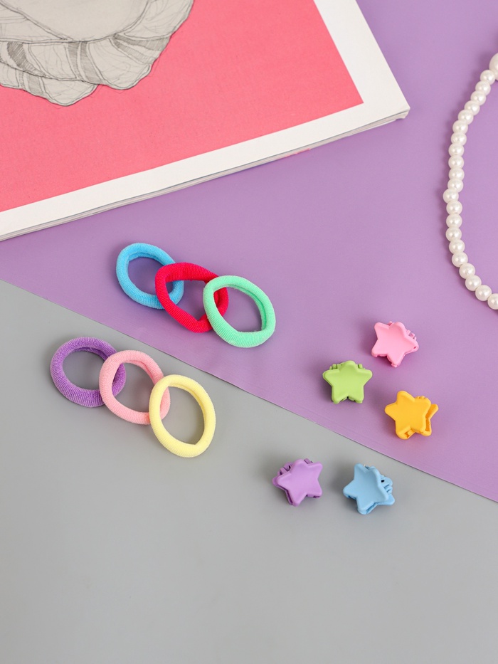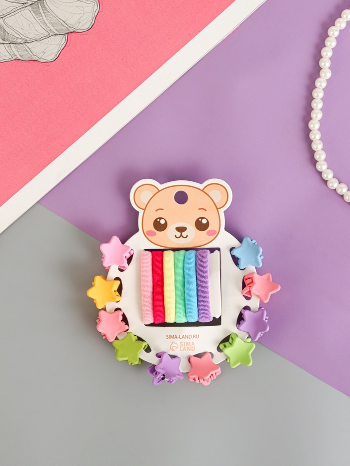 Комплект включает 6 резинок и 10 мини-крабиков в виде звёздочек. Все аксессуары выполнены из безопасных для детей материалов, что делает их идеальными для ежедневного использования.