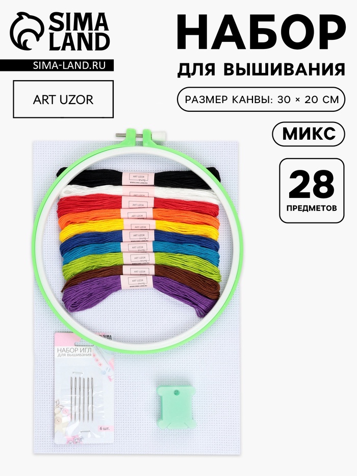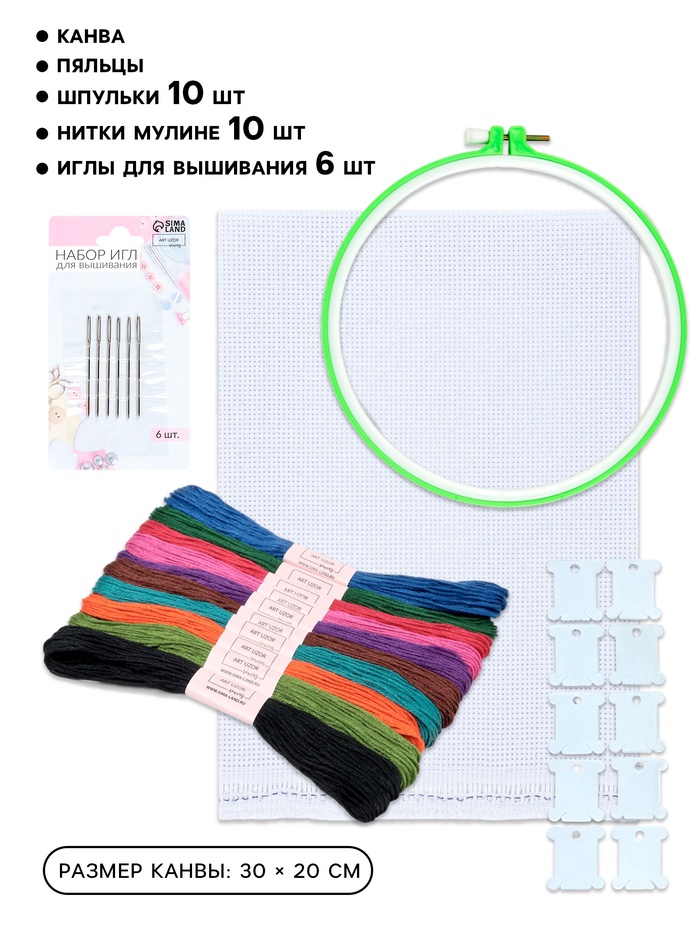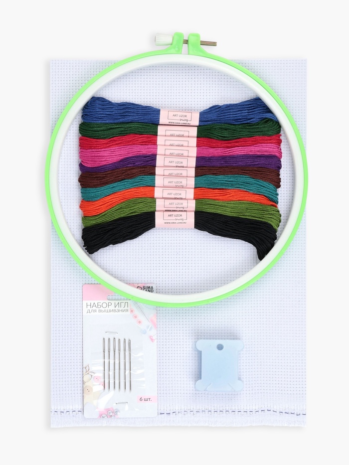 Основой комплекта служит однотонная хлопковая канва Аида размером 30×20 см с каунтом 11 ct — идеальный вариант для как начинающих, так и опытных рукодельников. В наборе вы найдёте всё необходимое: палитру из 10 ярких ниток (цвет МИКС), удобные пяльцы диаметром 18 см, 6 иголок разных размеров и даже 10 дополнительных шпулек для расширения вашей цветовой гаммы.