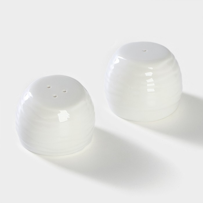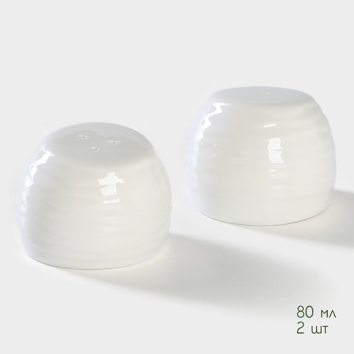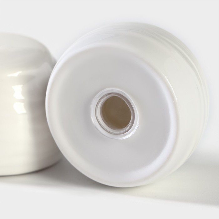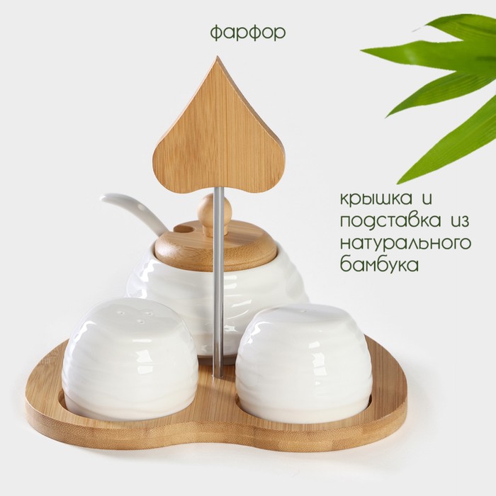 Набор фарфоровый для специй на деревянной подставке Доляна «Эстет», 3 предмета: солонка 80 мл, перечница, 80 мл, сахарница с ложкой 170 мл, цвет белый