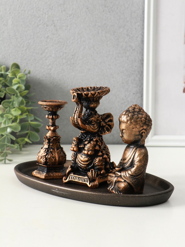 Набор фигур "Буддийский" на подносе, высота 13 см, цвет винтажная бронза