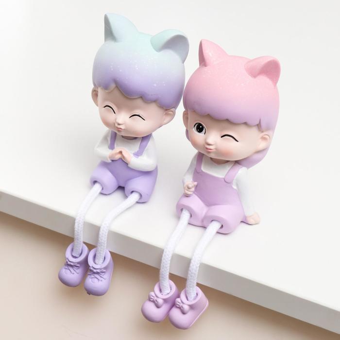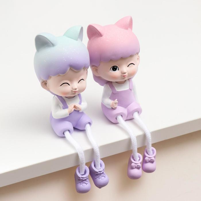 Этот необычный набор из двух фигурок высотой 19 см — воплощение детской непосредственности и волшебства. Малыш и малышка-кошка с длинными ножками создают трогательную композицию, где реальность переплетается с фантазией, а сиреневые оттенки добавляют нотку сказочности.