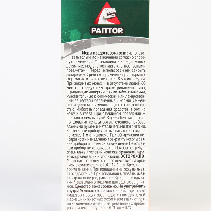 ОписаниеСредство применять в хорошо проветриваемых помещениях или при открытых форточках и окнах не более 8 часов при непрерывной работе прибора; в закрытых помещениях не более 2 часов в отсутствие людей с последующим проветриванием. Не касаться включенного прибора влажными руками и металлическими предметами. Включать прибор на расстоянии не менее 1 м от человека. Хранить отдельно от пищевых продуктов в месте, недоступном для детей и домашних животных. Лица, страдающие аллергическими заболеваниями, должны применять средство с осторожностью. При появлении дискомфортных ощущений прекратить использование средства и проветрить помещение. Закрыть аквариум на время работы прибора. ОСТОРОЖНО! Средство относится к малоопасным препаратам по воздействию на организм. Средство обладает раздражающим действием на слизистые оболочки глаз. Средство пожароопасно.Состав жидкости: эток (праллетрин) - 0,9%; отдушка; стабилизатор; растворители.ИнструкцияАккуратно снимите колпачок с флакона, вставьте стержень в прибор и плотно прикрутите. Или аккуратно извлеките пластину из упаковки и вставьте в нагревательный прибор.Включите прибор (в местах, где он не будет закрыт мебелью) в электросеть (220 В).Активное вещество начинает действовать через 10-15 минут после включения.После окончания работы выключите прибор из сети. Жидкость можно использовать до полного испарения из флакона.