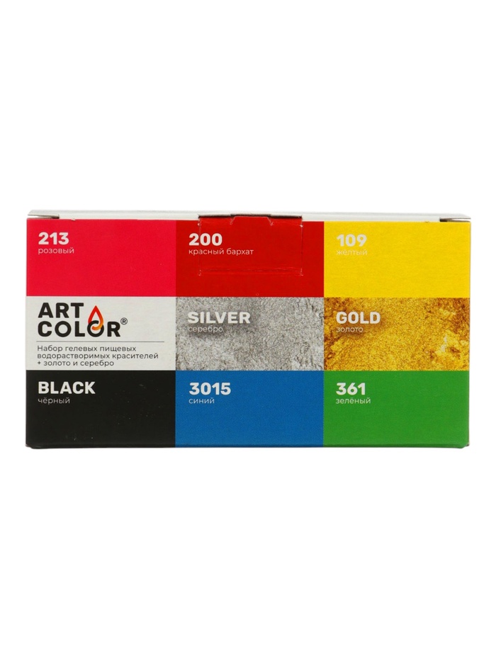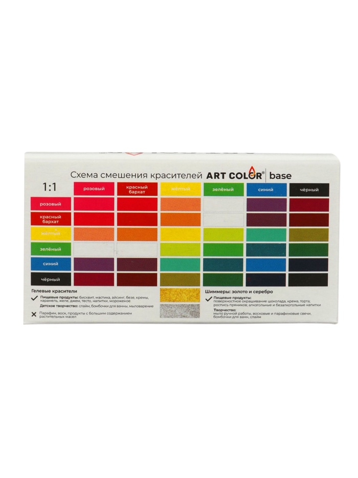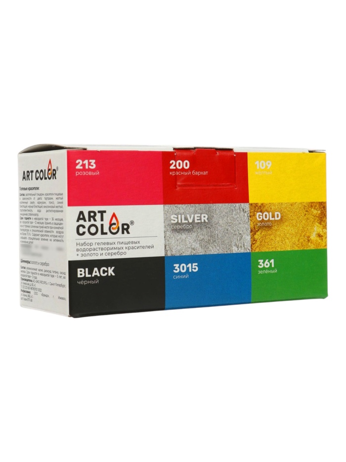 Полная палитра для кондитерских шедевров. Набор гелевых красителей Art Color Base 8 цветов — это комплект водорастворимых пищевых красителей для десертов. В набор входят 6 базовых цветов (жёлтый, зелёный, розовый, красный, синий, чёрный) и два металлика — золото и серебро. Форма выпуска: гель в ёмкостях, сухой порошок для металликов.