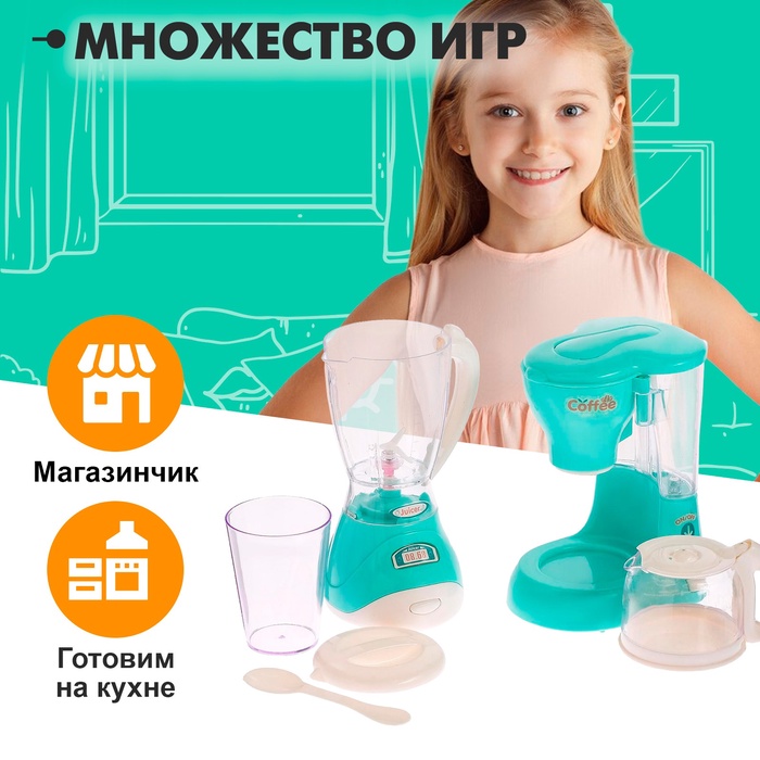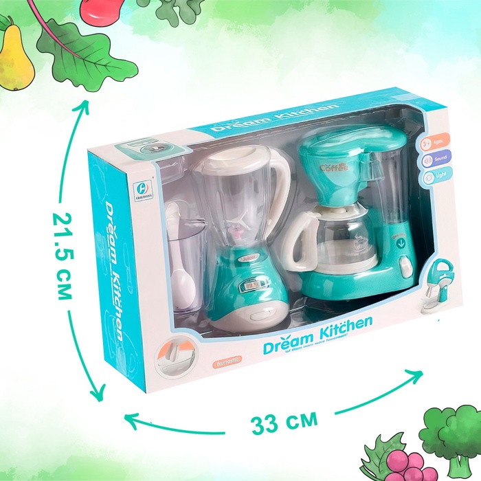 - В комплекте — блендер и кофеварка с реалистичными звуковыми и световыми эффектами.