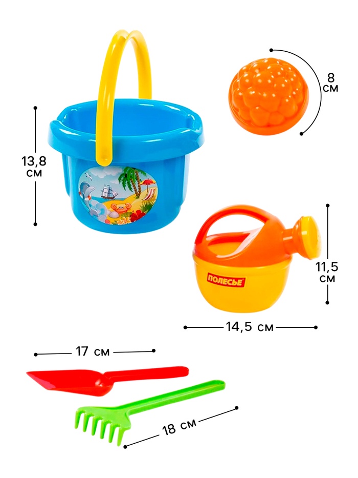 - В набор входят все необходимые инструменты для игр в песочнице. Ребёнок сможет копать, строить и украшать свои песочные шедевры.