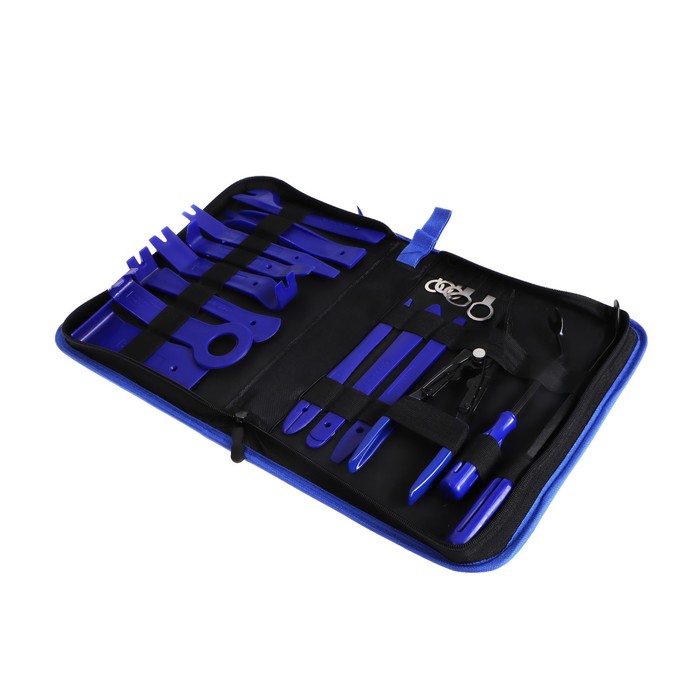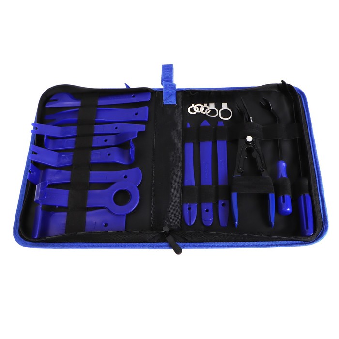 Съемники обшивок, для упрощенного снятия клипс и пистонов в салоне автомобиля. Комплект инструментов для разборки салона автомобиля, позволяет аккуратно разобрать салон, без повреждений элементов, провести демонтаж внутренней обивки, молдинга, магнитолы и других пластиковых частей внутренней отделки, не царапая и не нанося повреждений окрашенным, хромированным и другим поверхностям. Набор инструмента является универсальным и подходит для любого автомобиля.