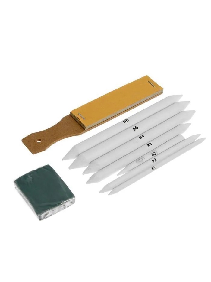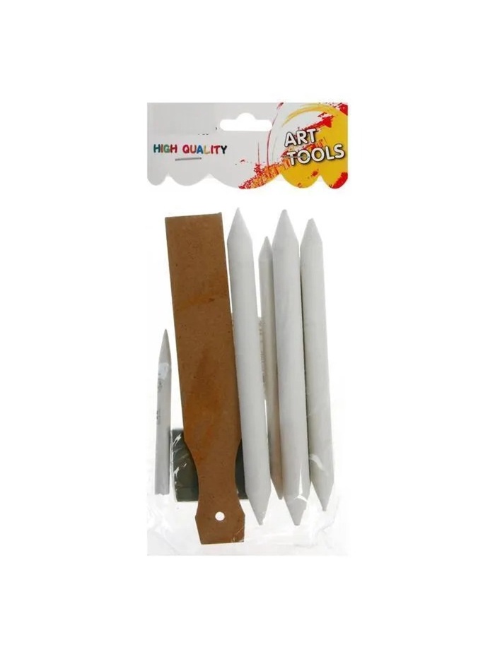 Набор инструментов для растушевки: в наборе 8 штук растушевок различного диаметра, наждачная бумага - 12 листов, ластик.
