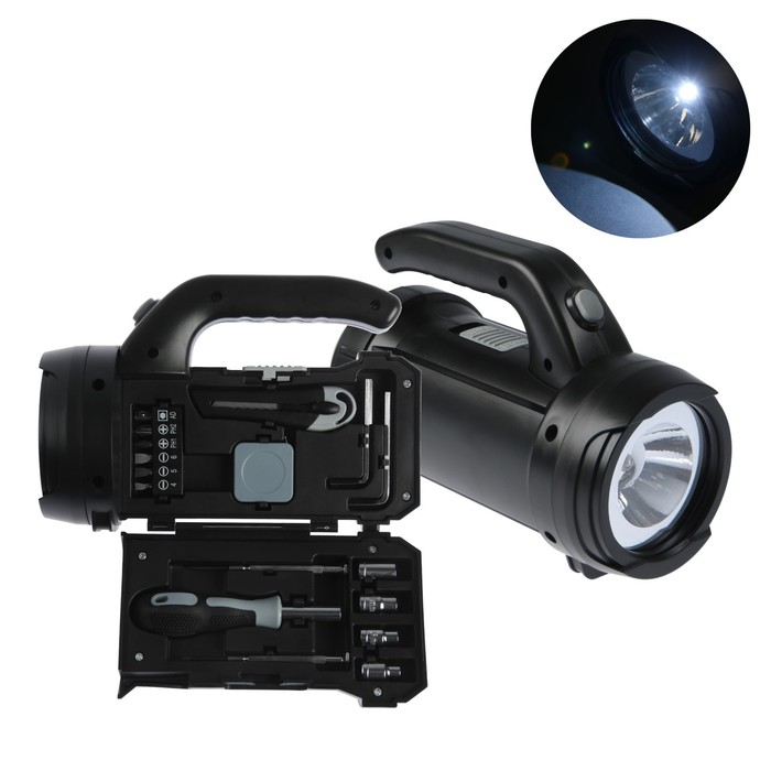 Встроенный фонарик позволяет осуществлять действия в темноте. Питание фонарика происходит от батареек (в комплекте не предоставляются). Набор обладает компактными размерами, что позволяет его хранить как дома, так и в автомобиле.