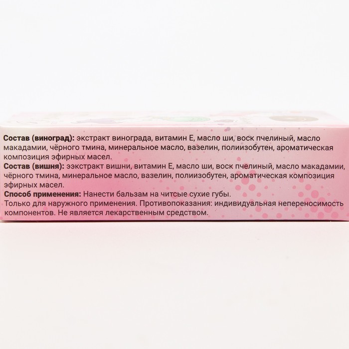 Состав: экстракты фруктов и ягод, витамин Е, масло ши, воск пчелиный, масло макадамии, масло черного тмина, минеральное масло, вазелин, полиизобутен, ароматическая композиция эфирных масел.