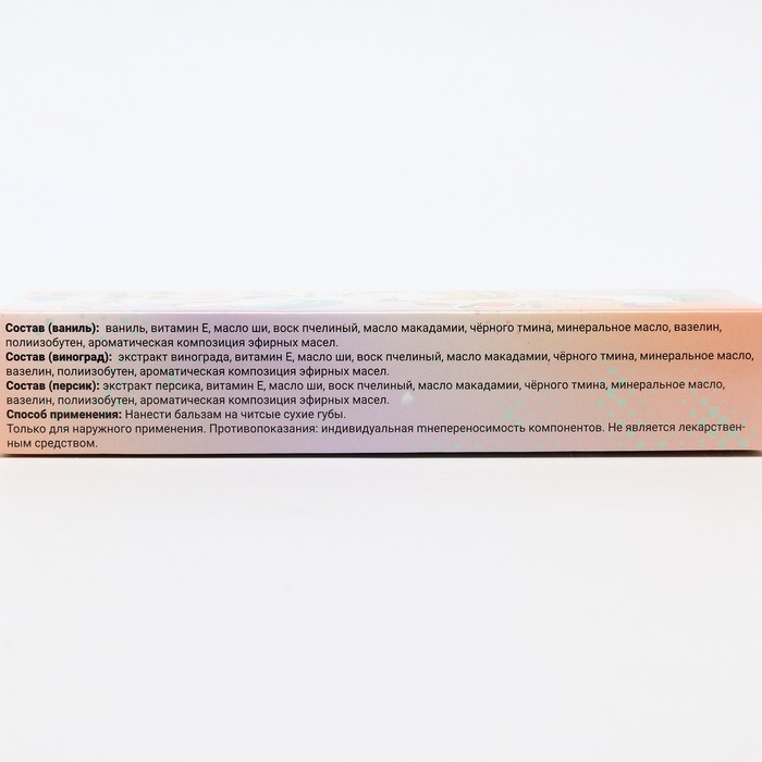 Состав: экстракты фруктов и ягод, витамин Е, масло ши, воск пчелиный, масло макадамии, масло черного тмина, минеральное масло, вазелин, полиизобутен, ароматическая композиция эфирных масел.