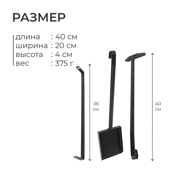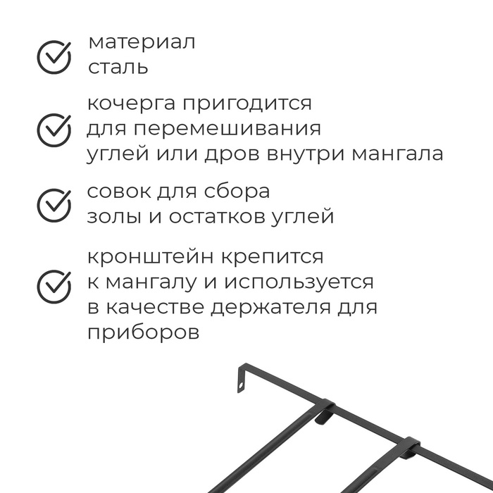 Кочерга пригодится для перемешивания углей или дров внутри мангала. Совок послужит для сбора золы и остатков углей. Кронштейн крепится к мангалу и используется в качестве держателя для других приборов из комплекта.
