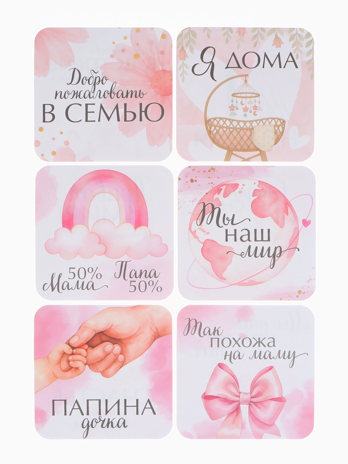 Этот нежный набор фотокарточек создан для того, чтобы красиво сохранить первые мгновения жизни малышки. С помощью карточек легко оформлять домашние фотосессии, фиксировать важные события и наполнять семейный альбом тёплыми снимками. Акварельные иллюстрации в мягких розовых оттенках подчёркивают атмосферу детства и делают каждую фотографию по-настоящему трогательной.