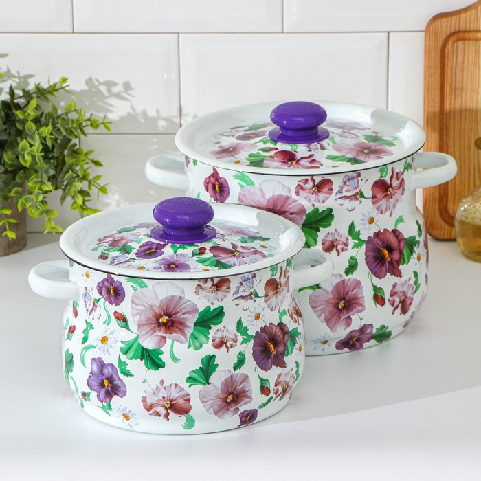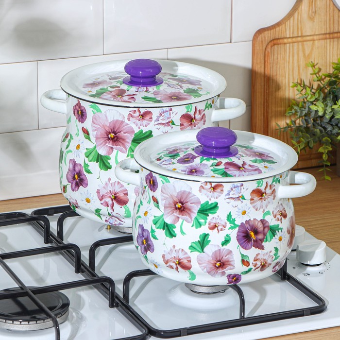 Кастрюли сделаны из качественной стали, покрытой эмалью с декоративным рисунком. Они отлично подходят для приготовления и хранения различных блюд.