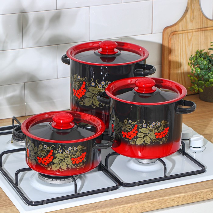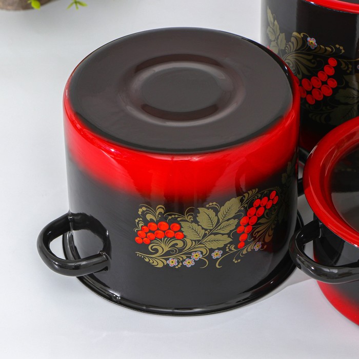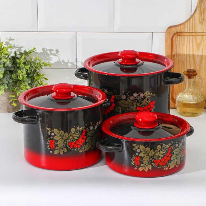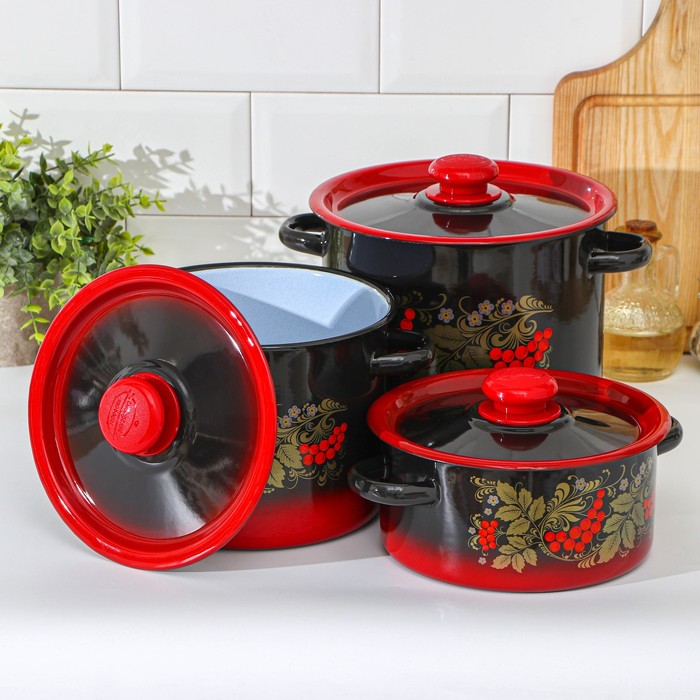 Кастрюли сделаны из качественной стали, покрытой эмалью с декоративным рисунком. Они отлично подходят для приготовления и хранения различных блюд.