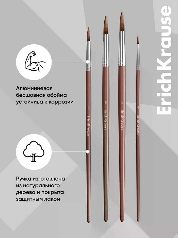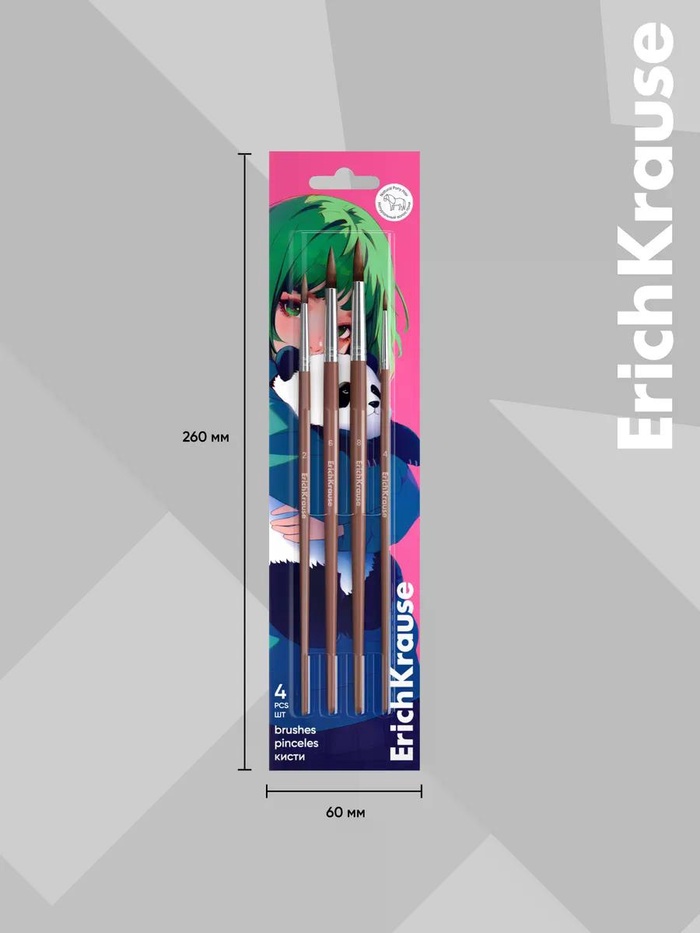 Кисти ErichKrause в коллекции Panda Hugs для для детского творчества и школьных работ. Изготовлены из натурального волоса пони, поэтому хорошо впитывают краску и держат форму. Рабочая часть кисти обработана составом, который защищает при хранении и транспортировке. Ручка из натурального дерева покрыта защитным лаком. Цельнометаллическая бесшовная обойма из алюминия не ржавеет. В наборе кисти круглые № 2, 4, 6, 8.