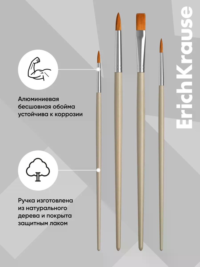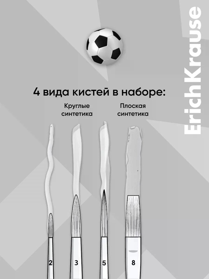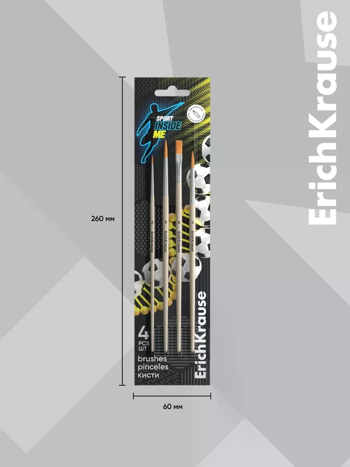 Кисти ErichKrause из синтетического ворса для акварельных красок и гуаши в коллекции Sport DNA помогут покорить новые творческие высоты. Рабочая часть кисти обработана составом, который защищает при хранении и транспортировке. Ручка из натурального дерева покрыта защитным лаком. Цельнометаллическая бесшовная обойма из алюминия не ржавеет. В наборе кисти круглые № 2, 3, 5 и плоская № 8.