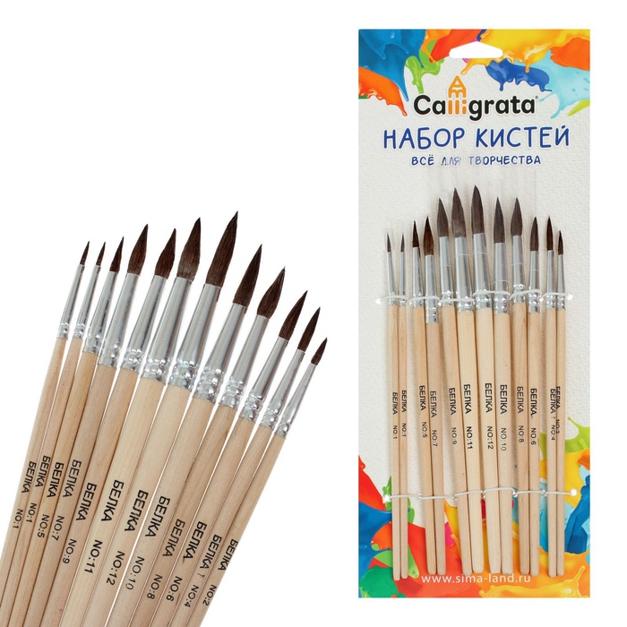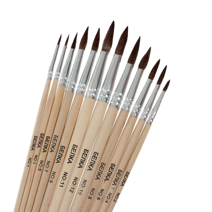 Набор кистей для рисования, белка, 12 штук: № 1, 2, 3, 4, 5, 6, 7, 8, 9, 10, 11, 12, круглые, деревянная ручка, международный размер