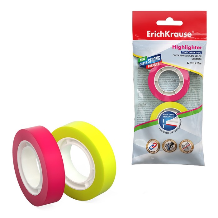 Набор клейкой ленты канцелярской, 12 мм х 20 метра, ErichKrause "Highlighter", 2 штуки, прозрачная, цветная