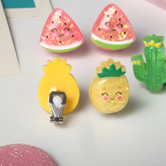 Набор из трёх пар клипс с яркими разноцветными вставками воплощает атмосферу тропиков и летнего настроения, делая каждую детскую причёску особенной. Металлическая основа с серебристым покрытием придаёт аксессуарам изящность и надёжность, а пластик — яркость и лёгкость.