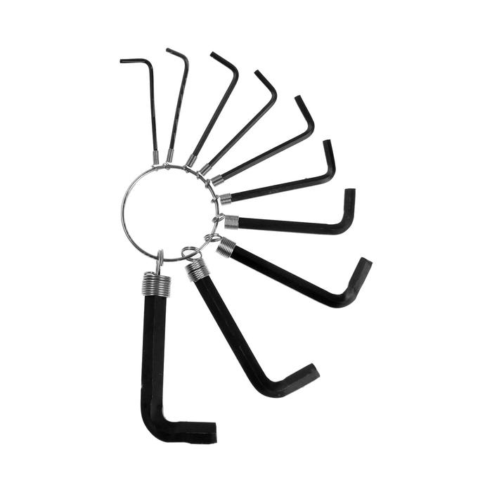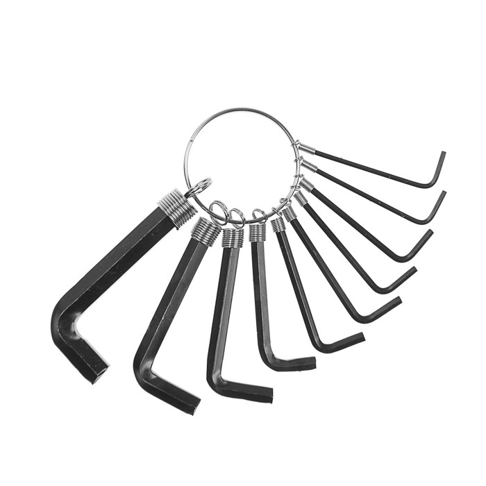 Ключи изготовлены из высококачественной стали, не подвержены окислению и коррозии, прочны, надежны и удобны в использовании. Комплект включает инструменты Г-образной формы разного размера.
