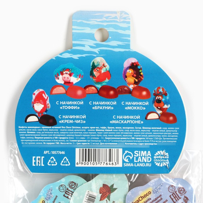 Конфеты шоколадные с кремовой начинкой Viva Choco Christmas, ассорти: крем-чиз, тоффи, брауни, мокко, маскарпоне. Состав: Шоколад молочный: сахар, молоко сухое цельное, масло какао, какао тёртое, эмульгатор - лецитин соевый, ароматизатор - ванилин. Шоколад темный: какао тёртое, сахар, масло какао, эмульгатор - лецитин соевый, ароматизатор - ванилин. Начинка: сахар, растительные масла, сыворотка сухая молочная, какао - порошок, творог сухой (молоко сухое обезжиренное, молоко сухое цельное, заквасочная культура), молоко сухое карамелизованное (молоко сухое обезжиренное), шоколад тёмный в порошке (какао тёртое, сахар, какао - порошок), эмульгатор - лецитин соевый, ароматизаторы: мокко, маскарпоне, тоффи, шоколад.