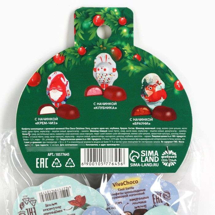 Конфеты шоколадные с кремовой начинкой Viva Choco Christmas, ассорти: крем-чиз, тоффи, брауни, мокко, маскарпоне. Состав: Шоколад молочный: сахар, молоко сухое цельное, масло какао, какао тёртое, эмульгатор - лецитин соевый, ароматизатор - ванилин. Шоколад темный: какао тёртое, сахар, масло какао, эмульгатор - лецитин соевый, ароматизатор - ванилин. Начинка: сахар, растительные масла, сыворотка сухая молочная, какао - порошок, творог сухой (молоко сухое обезжиренное, молоко сухое цельное, заквасочная культура), молоко сухое карамелизованное (молоко сухое обезжиренное), шоколад тёмный в порошке (какао тёртое, сахар, какао - порошок), эмульгатор - лецитин соевый, ароматизаторы: мокко, маскарпоне, тоффи, шоколад.
