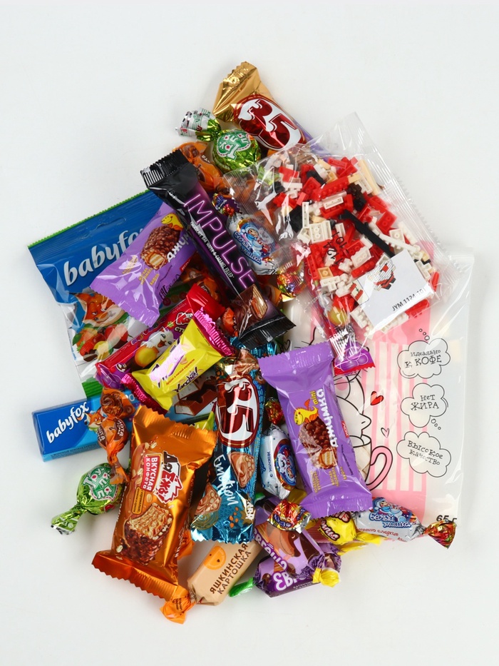 ПРИ ОФОРМЛЕНИИ ЗАКАЗА, ПРОСИМ ЗАПРАШИВАТЬ АКТУАЛЬНЫЕ СРОКИ ГОДНОСТИ У МЕНЕДЖЕРА. Вафельная конфета «Импульс» с мягкой карамелью, глазированная молочной шоколадной глазурьюCостав: глюкозный сироп, сахар, масла растительные, вода питьевая, молоко цельное сгущённое с сахаром (молоко цельное, молоко обезжиренное, сахар (сахароза), лактоза); мука пшеничная хлебопекарная, какао тёртое, какао-порошок, молоко сухое цельное, сыворотка молочная сухая деминерализованная, эмульгаторы: лецитины (рапсовый, соевый, подсолнечный), Е476; соль, крахмал кукурузный, ароматизаторы, продукты яичные, разрыхлители: гидрокарбонат натрия, гидрокарбонат аммония; антиокислитель: токоферолы, концентрат смеси. Возможно наличие диоксида серы, орехов, арахиса и продуктов их переработки. Глазурь молочная шоколадная: массовая доля молочного жира – не менее 2,5 %, массовая доля общего сухого остатка какао – не менее 15 %, массовая доля сухих веществ молока и (или) продуктов его переработки – не менее 14 %, массовая доля масла какао – не менее 8 %.Карамель с начинкой фруктового вкуса «Жевательное ассорти «Nils/Нильс»Состав: сахар, патока, масла растительные (антиокислитель: токоферолы, концентрат смеси), крахмал кукурузный, стабилизатор – гуммиарабик, влагоудерживающие агенты: сорбитовый сироп, лактат натрия; регуляторы кислотности: кислота молочная, лимонная кислота; желирующий агент – пектины, концентрированные соки яблока, чёрной моркови, красители: куркумин, экстракт паприки, синий блестящий FCF; ароматизаторы, эмульгатор – лецитин соевый. Может содержать диоксид серы, следы глютена, яиц, молока, арахиса, орехов и продуктов их переработки.Конфеты с корпусами на карамельной основе глазированные мини арахис «Yarche!»Состав: ядра арахиса жареные, патока, сахар, масла растительные (эмульгатор – сорбитан тристеарат, антиокислитель: токоферолы, концентрат смеси), сыворотка сухая молочная деминерализованная, какао-порошок, эмульгаторы: лецитины соевые, Е476; молоко цельное сгущённое с сахаром (молоко цельное, молоко обезжиренное, сахар (сахароза), лактоза), соль, ароматизаторы. Может содержать диоксид серы, следы глютена, яиц, орехов и продуктов их переработки.Жевательный мармелад: ассорти вкусов с витаминамиСостав: глюкозно-фруктозный сироп, сахар, желатин, регулятор кислотности – лимонная кислота, концентрированные соки: яблочный, вишнёвый, апельсиновый, клубничный, лимонный, чёрной смородины, чёрной моркови; агент желирующий – пектины, глазирователь – воск карнаубский, ароматизаторы, красители: каротины, куркумин, синий блестящий FCF; витамины: С, В6, ниацин, пантотеновая кислота, фолацин. Может содержать консервант – диоксид серы.Карамель с ореховой начинкой «Жевательная ириска Нота Бум»Состав: сахар, патока, молоко цельное сгущённое с сахаром (молоко цельное, молоко обезжиренное, сахар (сахароза), лактоза); масла растительные (антиокислители: Е304(i), Е306); декстроза, паста ядер орехов фундука обжаренных, стабилизатор – гуммиарабик, соль, сыворотка молочная сухая деминерализованная, какао-порошок, влагоудерживающий агент – сорбитовый сироп, ароматизатор, эмульгатор – лецитин соевый. Может содержать диоксид серы, следы глютена, яиц, арахиса и продуктов их переработки.Конфеты с корпусами на основе дроблёного печенья глазированные «Яшкинская картошка»Состав: мука пшен