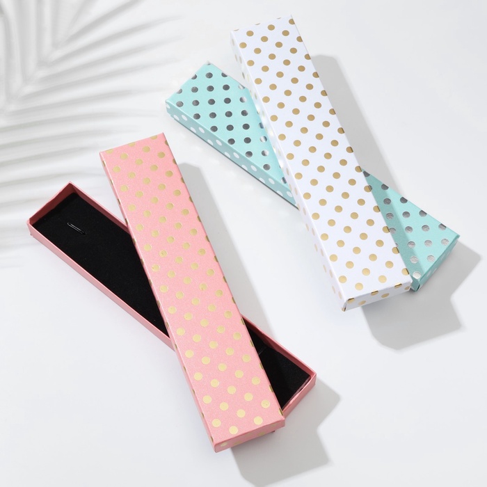 Прекрасная подача прекрасному подарку! Набор уникальных подарочных коробочек, созданный специально для украшений, теперь доступен в элегантном исполнении «горошинки золотые». Каждая коробка имеет удобные размеры 21х4 см, позволяющие бережно хранить и демонстрировать любые мелкие изделия, включая браслеты, цепочки и часы. Богатая палитра расцветок добавляет выразительности, подчеркивая индивидуальные предпочтения получателей.