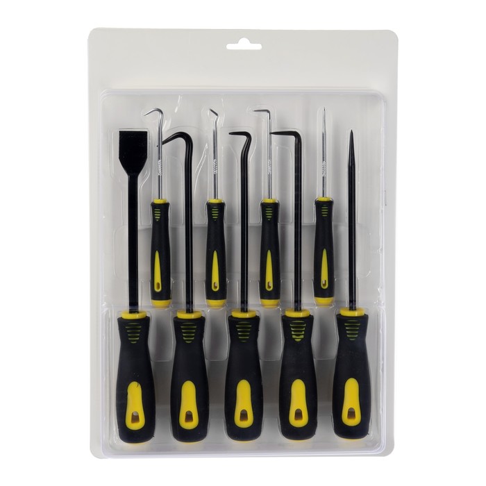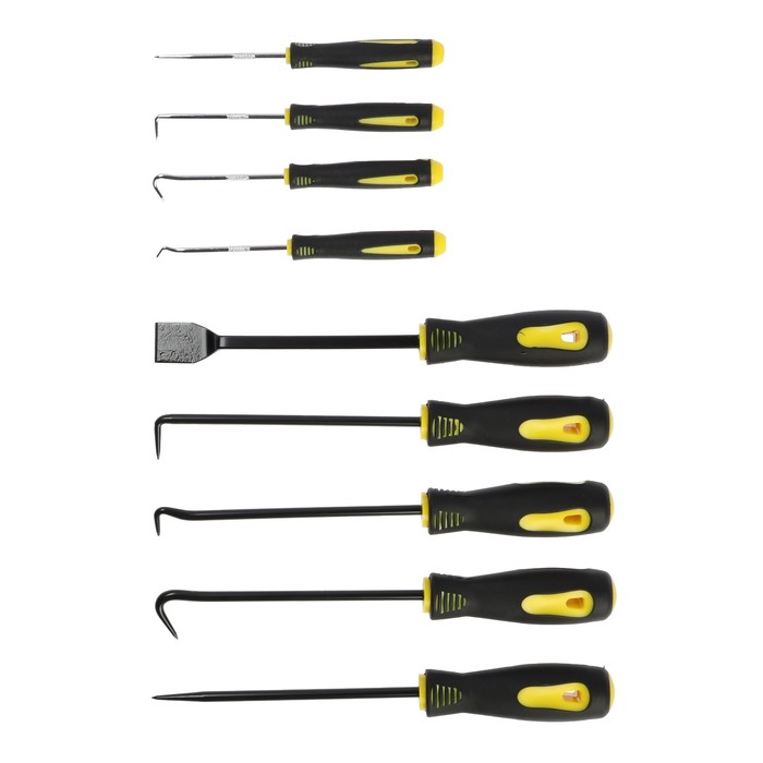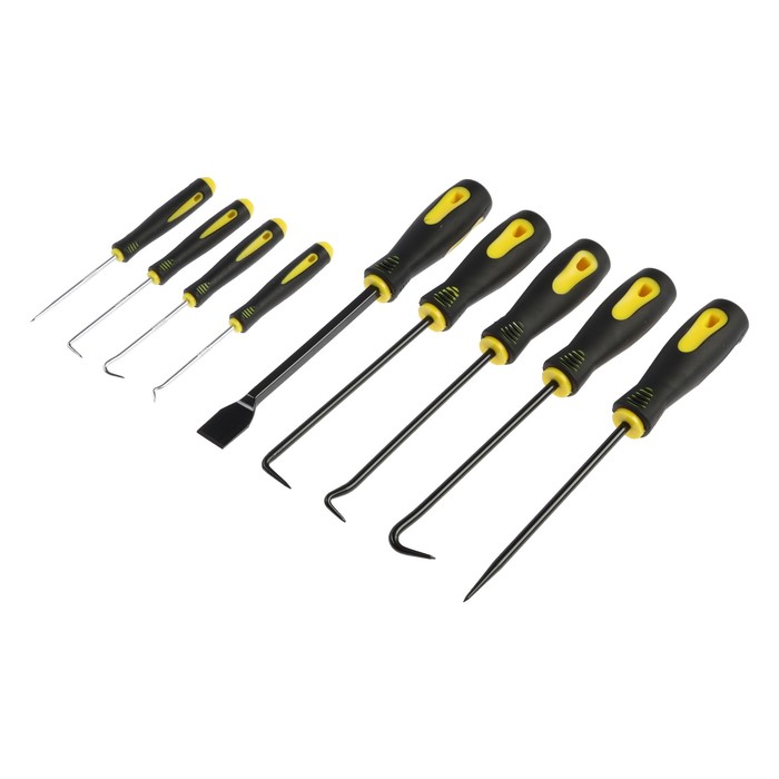 Полный комплект для сложного демонтажа уплотнений! Профессиональный набор крючков для колец ТУНДРА — это девять усиленных инструментов с двухкомпонентными рукоятками. Набор покрывает все задачи по извлечению уплотнительных колец в промышленном оборудовании и автомобильных узлах.