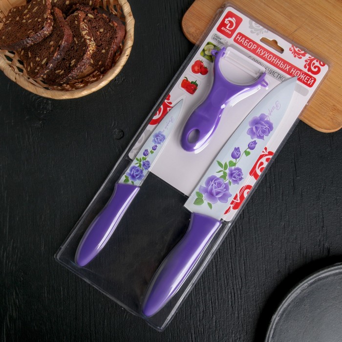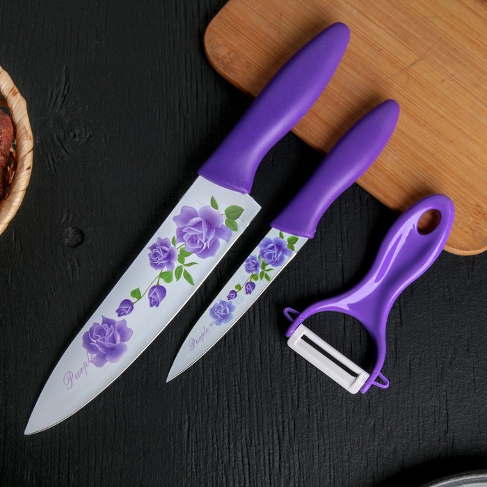 Кухонный набор с антипригарным покрытием — это практичные инструменты для ежедневной готовки, объединённые в едином стиле. В комплект входят два универсальных ножа и овощечистка. Лезвия из нержавеющей стали с антискользящим слоем обеспечивают чистый и лёгкий рез, а фиолетово-белые ручки с рисунком делают набор заметным элементом кухни. Простая форма и продуманная эргономика повышают удобство при нарезке и очистке.