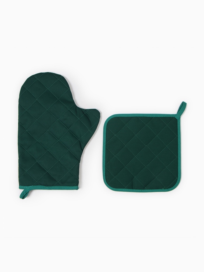- В комплекте две прихватки: варежка для чайников и кастрюль и квадратная для противней и сковород.