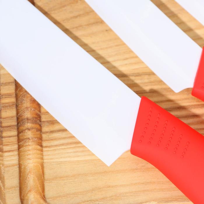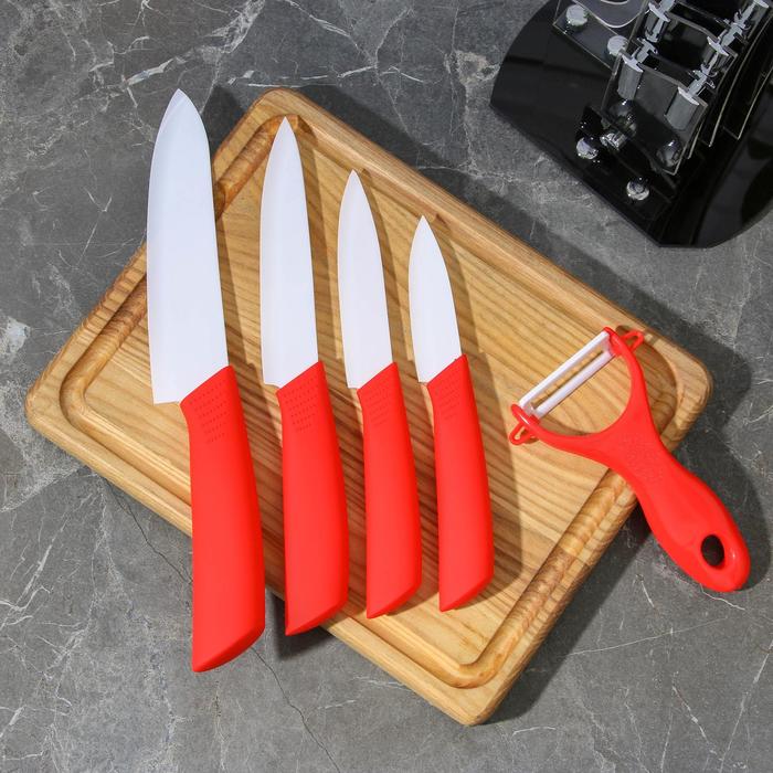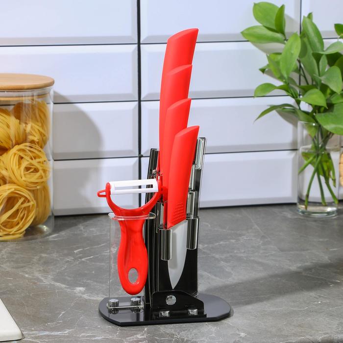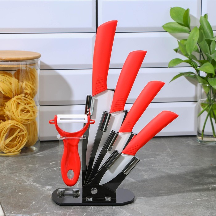 Такой полезный предмет, как Набор кухонный на подставке Доляна «Симпл», 5 предметов: ножи 7.5 см, 10.5 см, 13 см, 15 см, овощечистка, цвет красный, незаменим на Вашей кухне. Эргономичная пластиковая ручка позволяет держать нож свободно и максимально удобно. Нарезать продукты или чистить овощи — одно удовольствие! Благодаря сверхвысокой твёрдости керамического лезвия ножом можно резать без заточки долгие годы, на нём не появляются царапины, и при этом он ощутимо легче стального.
