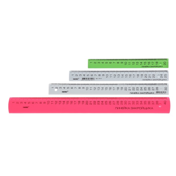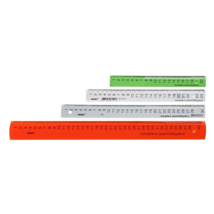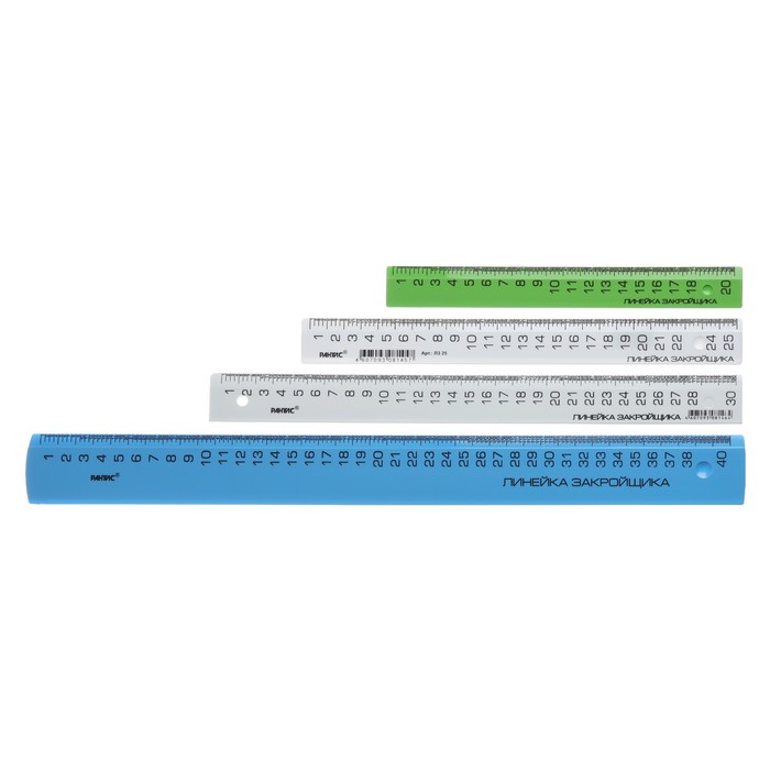 Линейка закройщика Calligrata предназначена для раскроя ткани, создания выкроек и моделирования одежды. Имеет 2 шкалы – сантиметровая и масштабная 1:4. Индивидуальный штрих-код на единице изделия. Представлена в длине 20/25/30/40 см