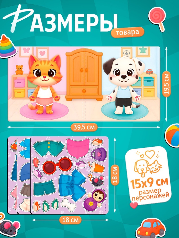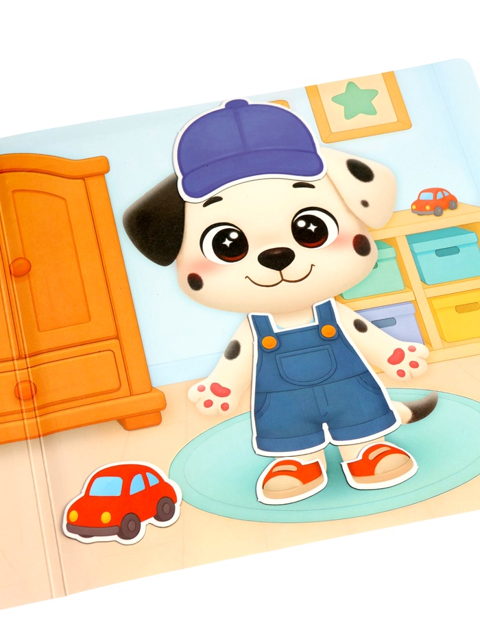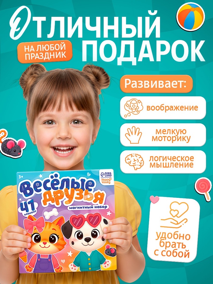 «Весёлые друзья» — это игровой магнитный набор, в котором ребёнок может наряжать пушистых героев, менять им одежду и придумывать свои истории. В комплект входит поле с комнатой и два милых персонажа — котёнок и щенок. Яркие детали, аксессуары и одежда превращают игру в увлекательное творчество, которое развивает воображение и мелкую моторику.