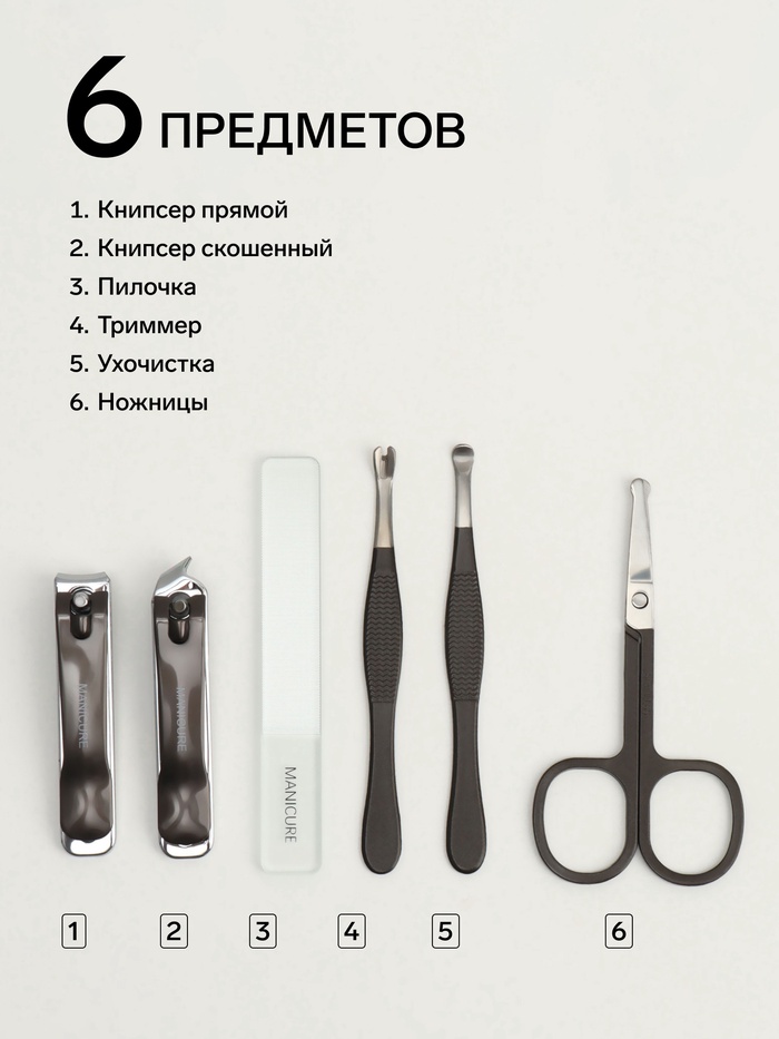 Комплект из 6 предметов, с помощью которых Вы сможете придать ногтям аккуратный и ухоженный вид, хранится в удобном футляре.