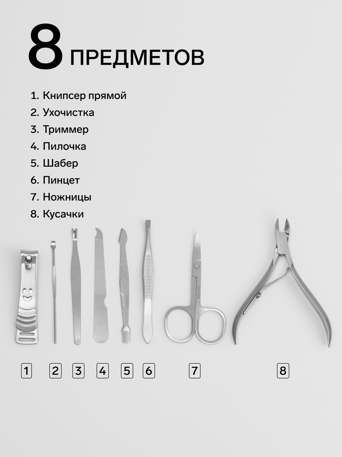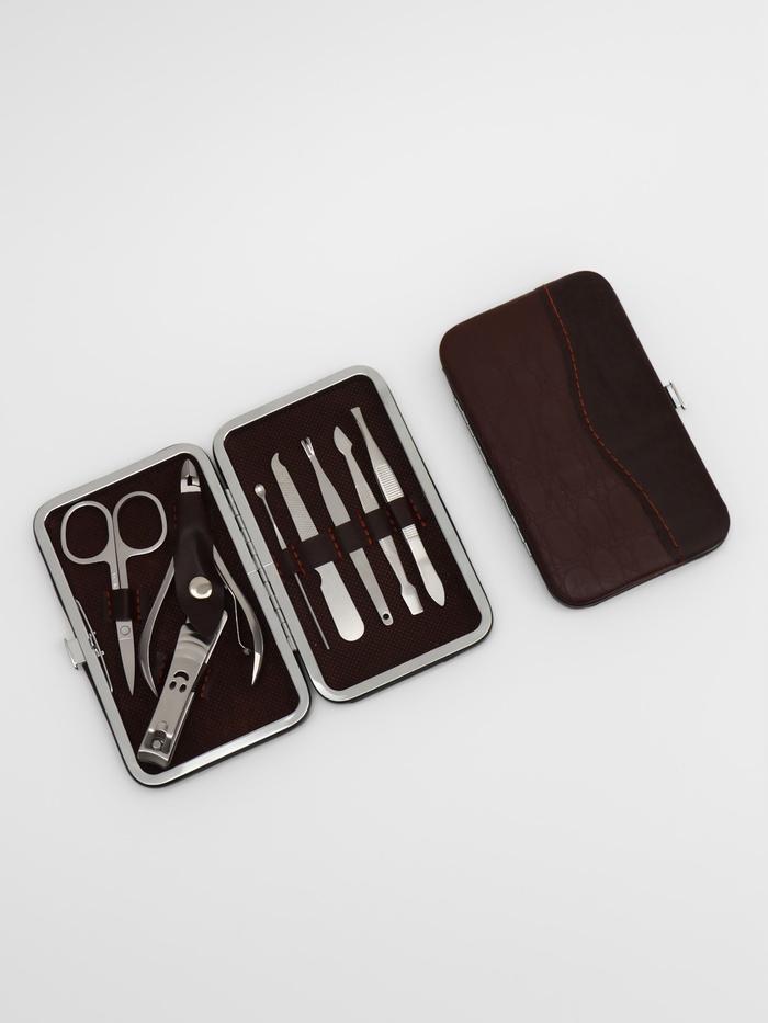 Оптимальный набор принадлежностей, стильный дизайн, компактность и универсальность — всё это о маникюрном наборе. Ножницы, кусачки, книпсер, металлическая пилка, триммер и пушер позаботятся о красоте ногтей, а пинцет и ухочистка помогут в уходе за собой.